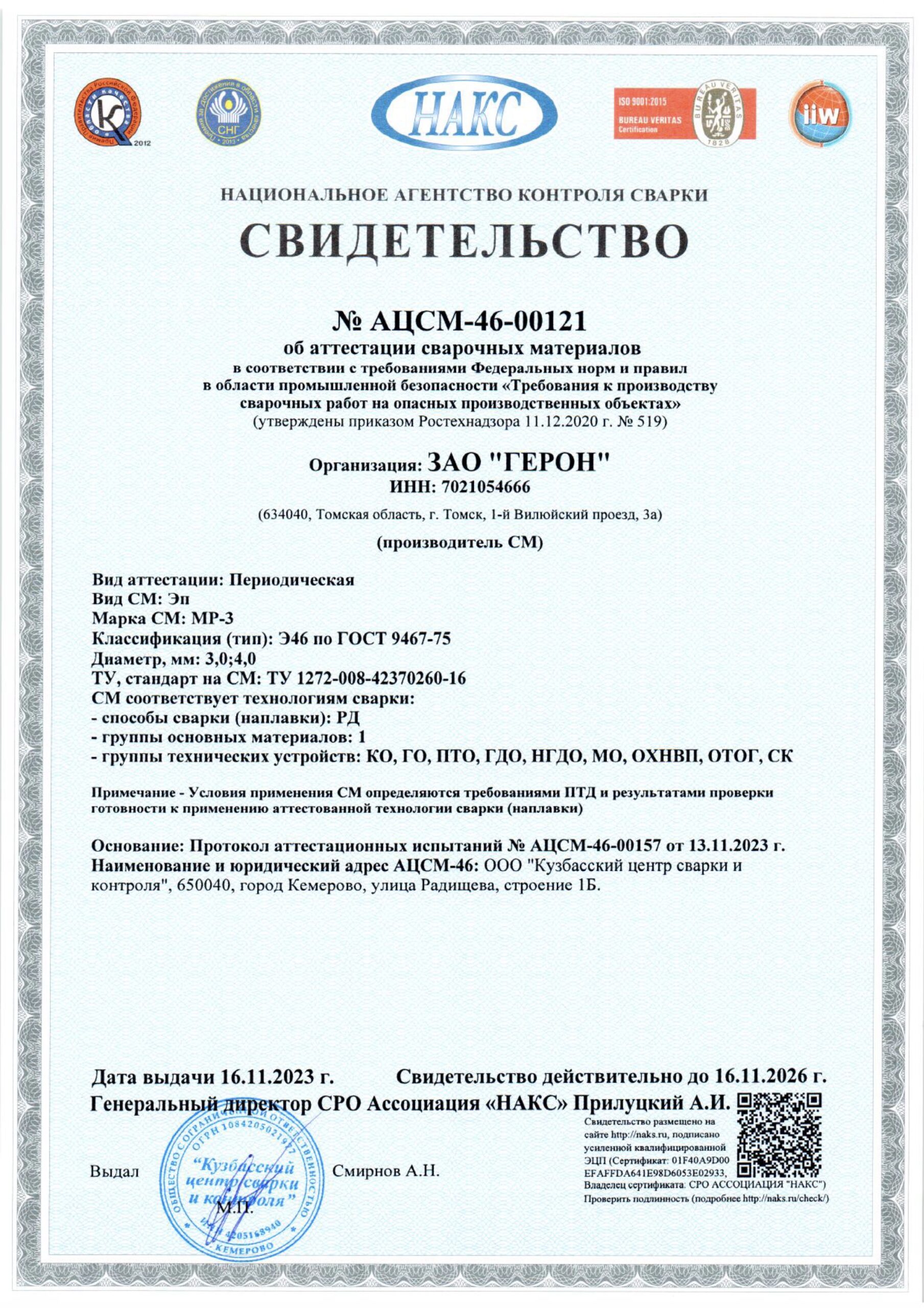 - Свидетельство об одобрении сварочных материалов (МР-3) — PDF