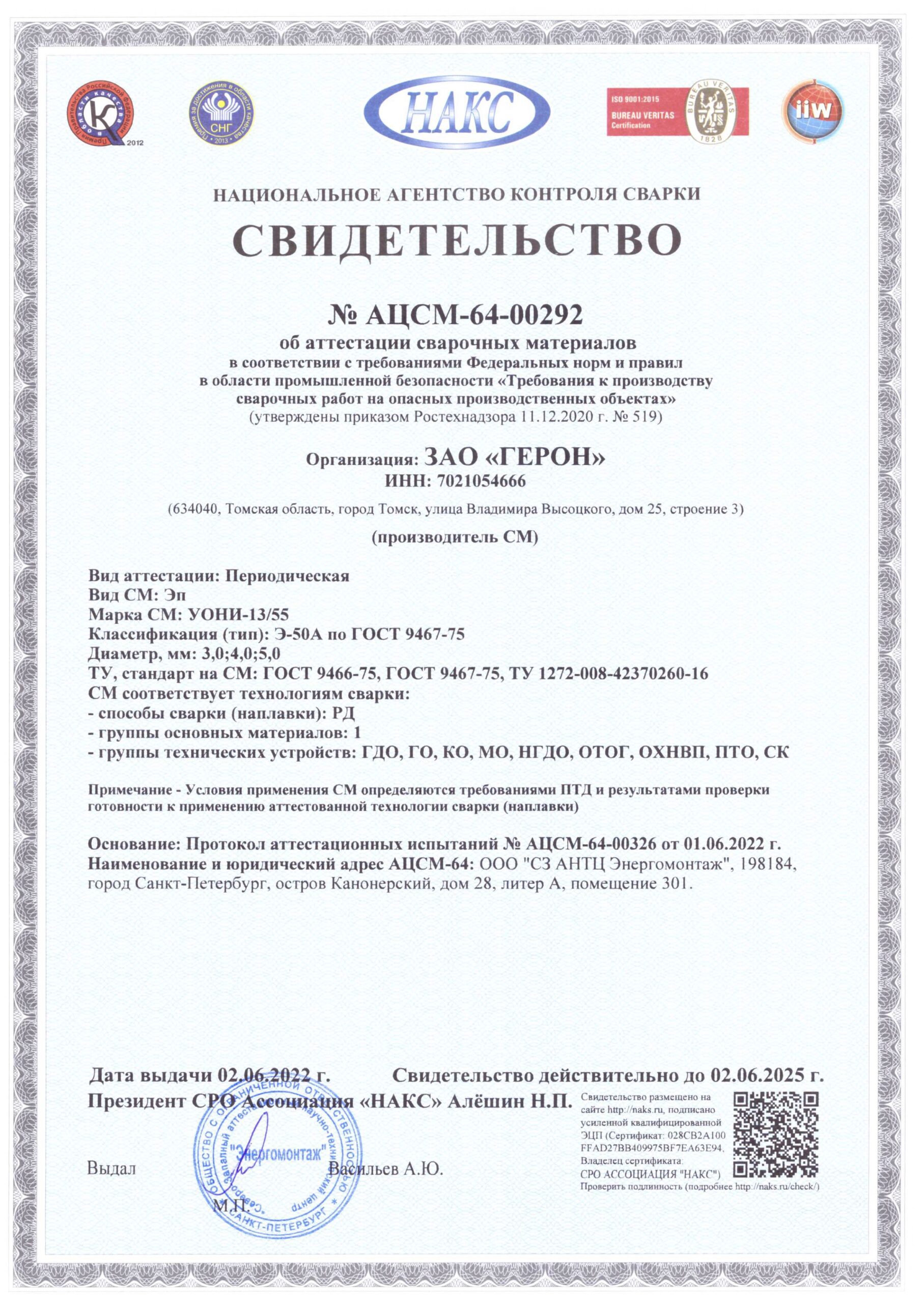 Часть электродов аттестовано Национальной Ассоциацией Контроля и Сварки (НАКС) в соответствии с требованиями РД 03-613-03 с выдачей Свидетельства на право использования электродов на опасных объектах. Сайт НАКС