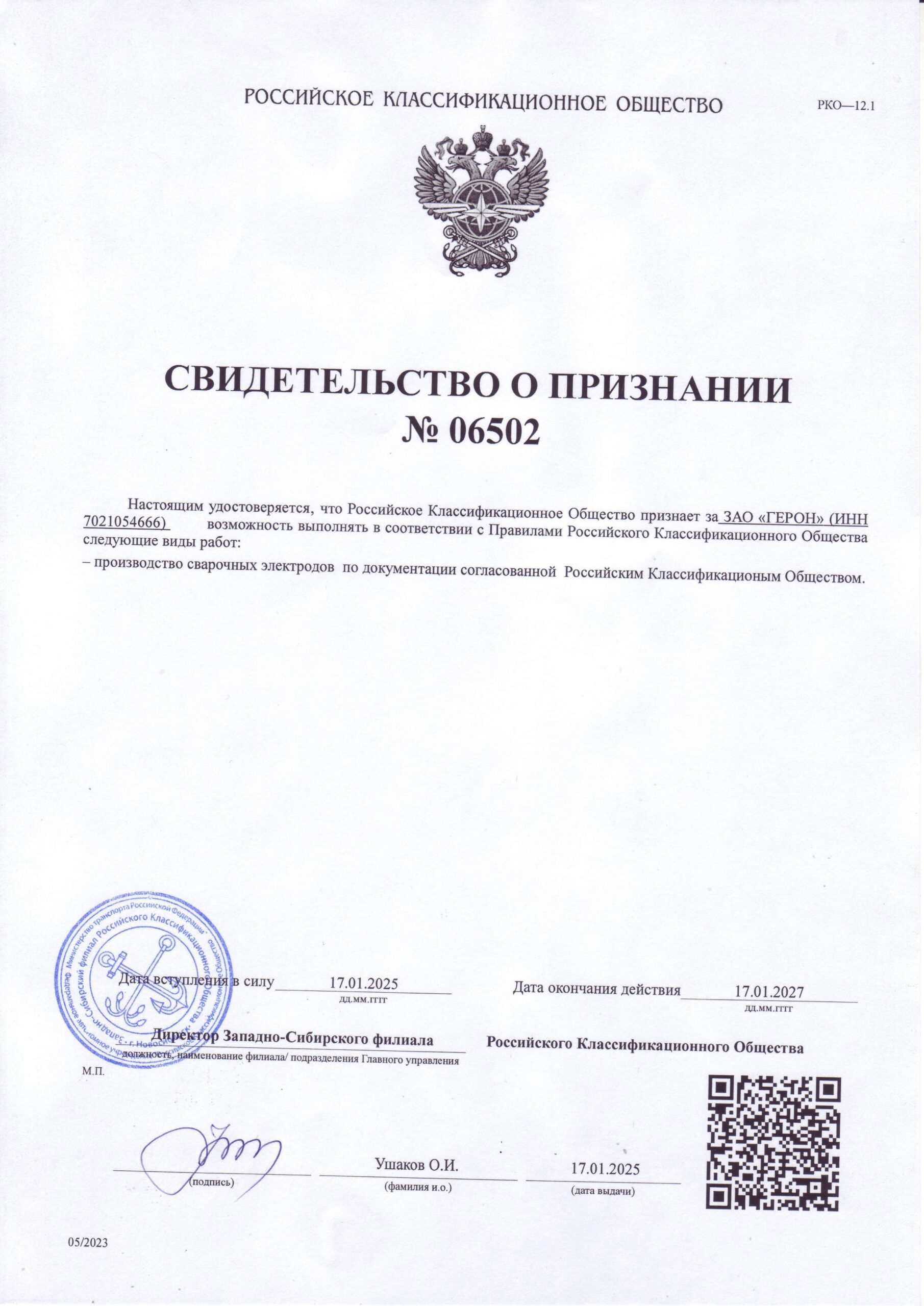 Предприятием получено Свидетельство о признании Российского Классификационного Общества, дающее право производить продукцию для предприятий судостроения и судоремонта с классом Речного Регистра. Отдельные марки имеют Сертификаты одобрения продукции Российского Речного Регистра. Сайт РКО